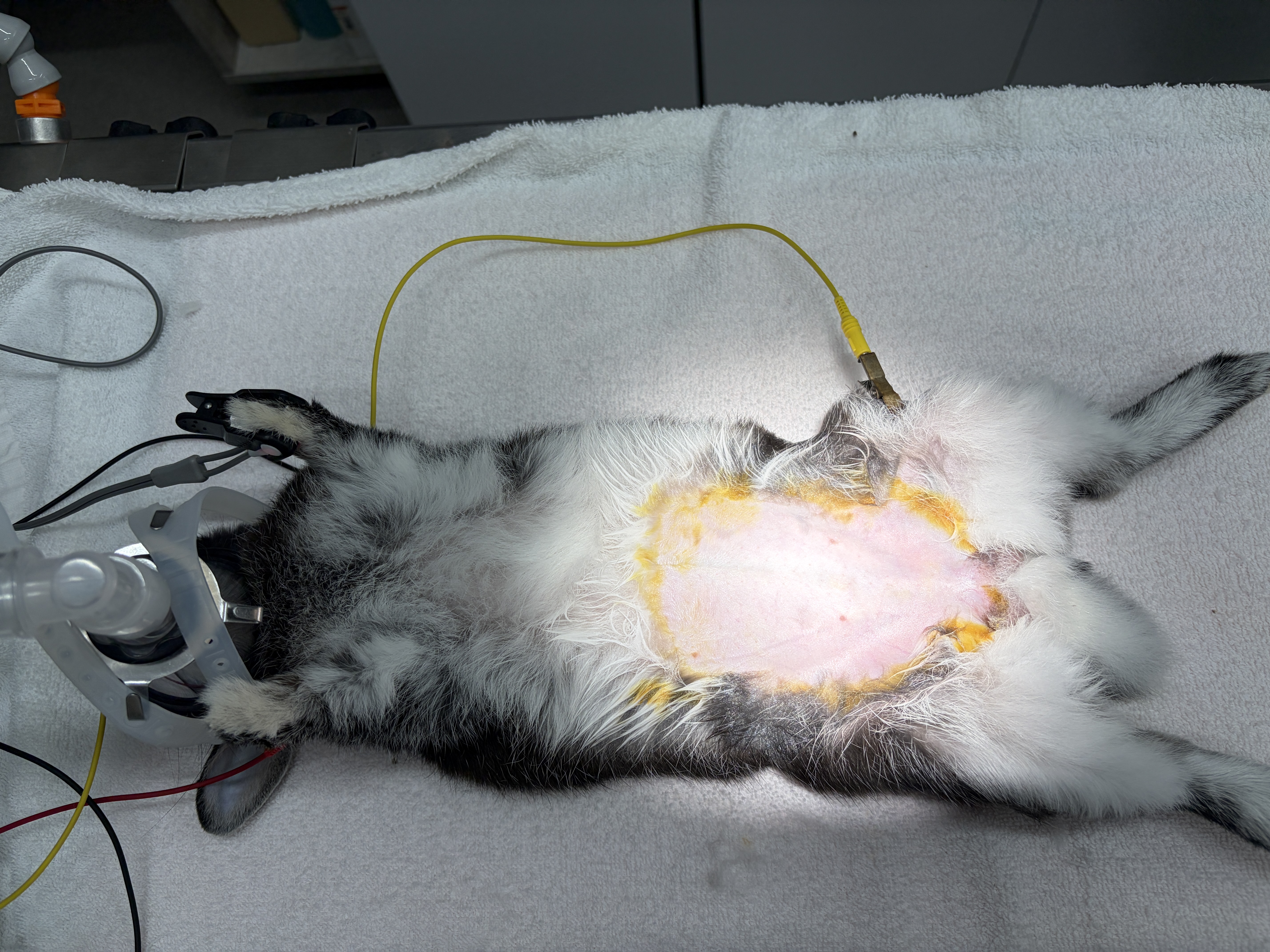 術前に麻酔をかけて毛刈りと消毒を行っているところです。
