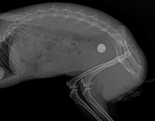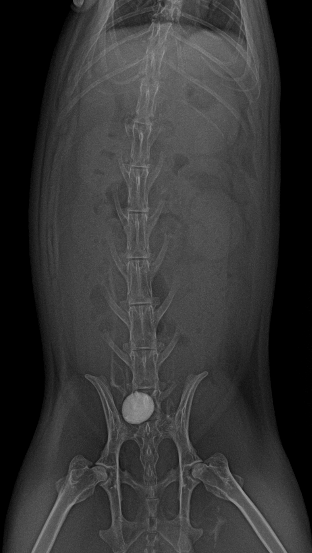 超音波検査では膀胱内に結石がみられました。レントゲン検査にて個数と、他の場所にも結石がないかどうか確認をしました。