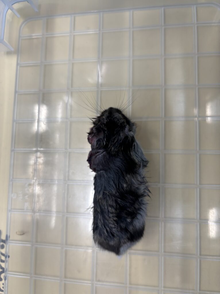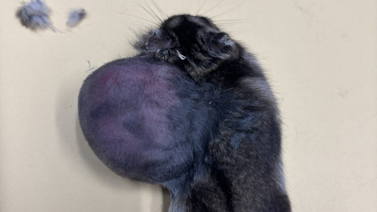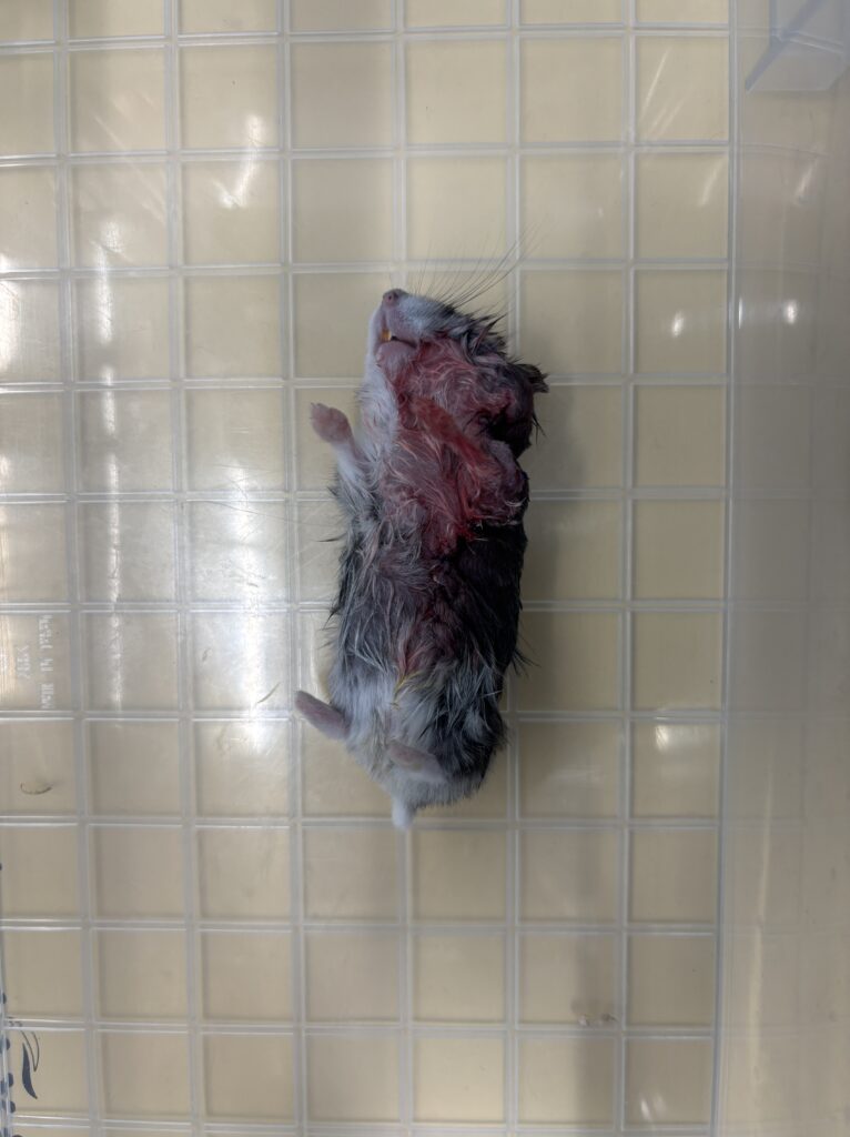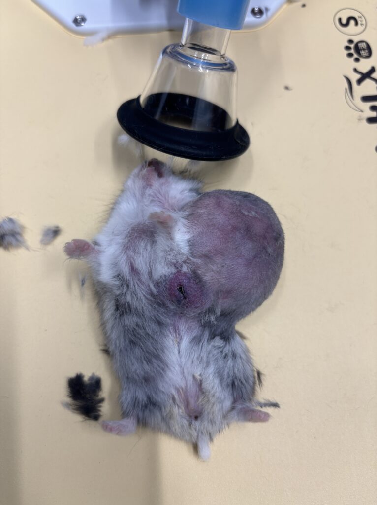 症例は1歳のハムスターで大型の腫瘍が発生していました。画像は麻酔をかけて毛刈りをしているところです。手術ではかなり広範囲を切ることになりましたが、無事に退院することができました。