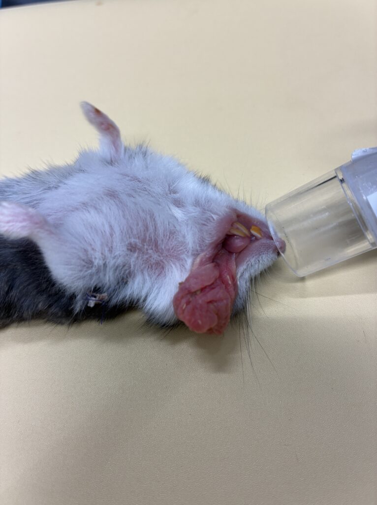 画像は麻酔前の状態・麻酔中術前の状態・手術後の状態です。頬袋は浮腫が起きて腫れており、もとに戻すことが難しい状態でした。頬袋が感染を起こすと全身に広がるなどして状態が悪くなることがあるため片側の頬袋の摘出手術を行います。術前はご飯が食べづらい状態でしたが、術後は問題なく食べられるようになりました。頬袋の脱出は緊急に対処したほうがいいこともあるため、異常がみられたら早めにご連絡ください。