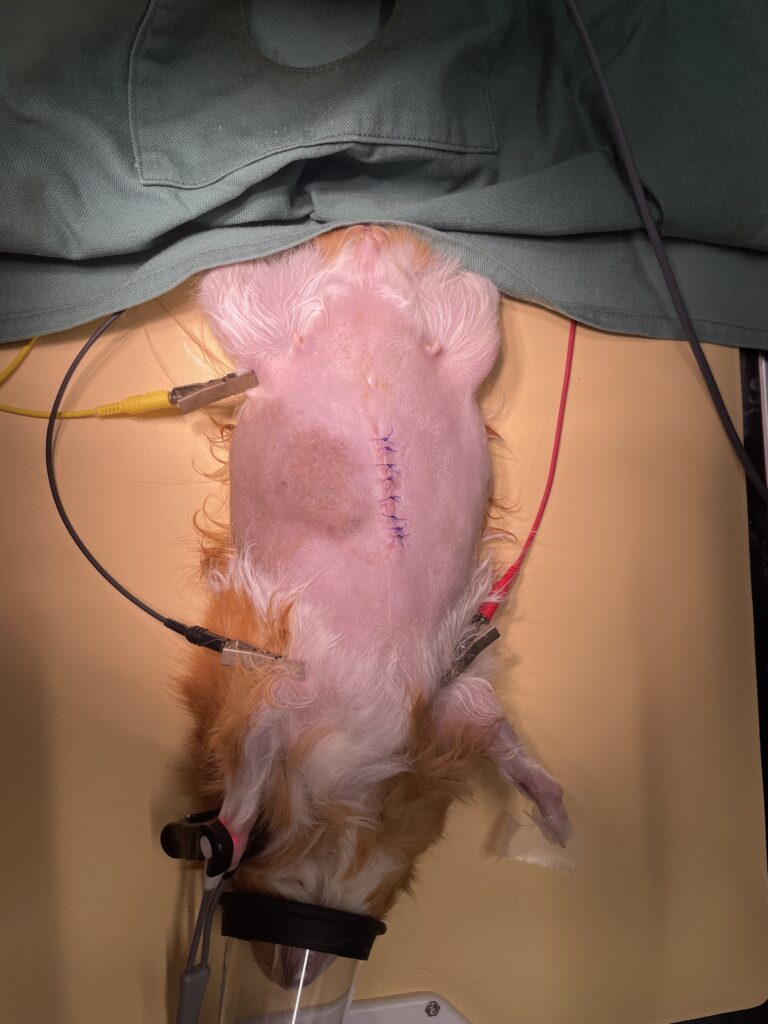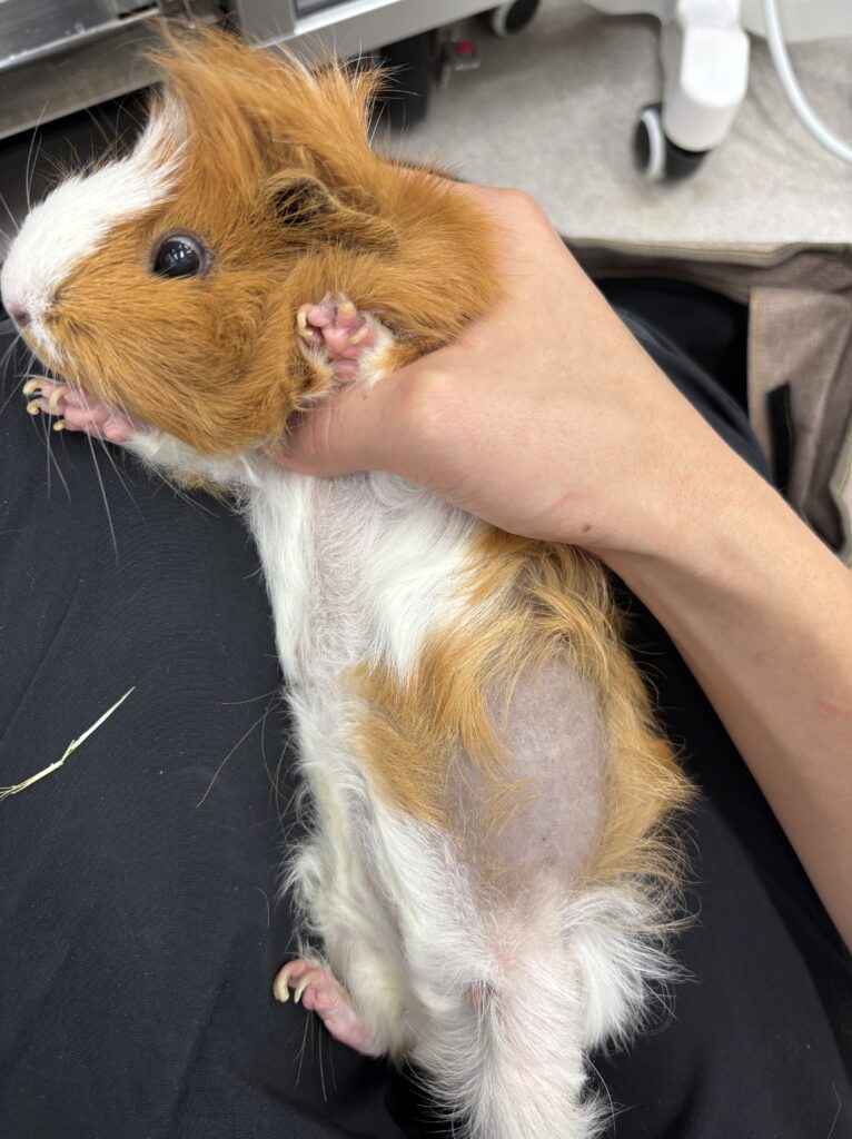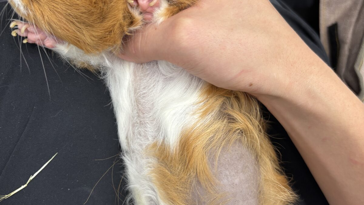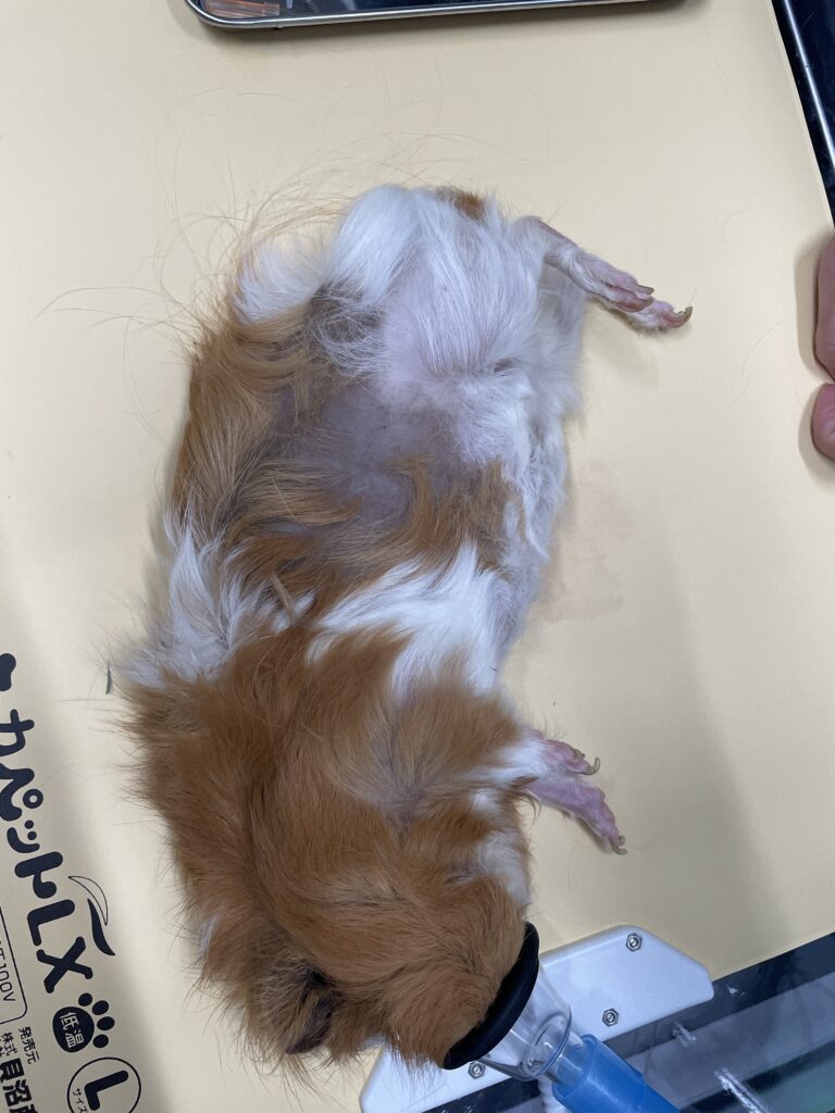 症例は4歳のメスのモルモットです。脱毛が見られ、卵巣の異常が見られるが他の動物病院では手術が難しいとのことで来院されました。