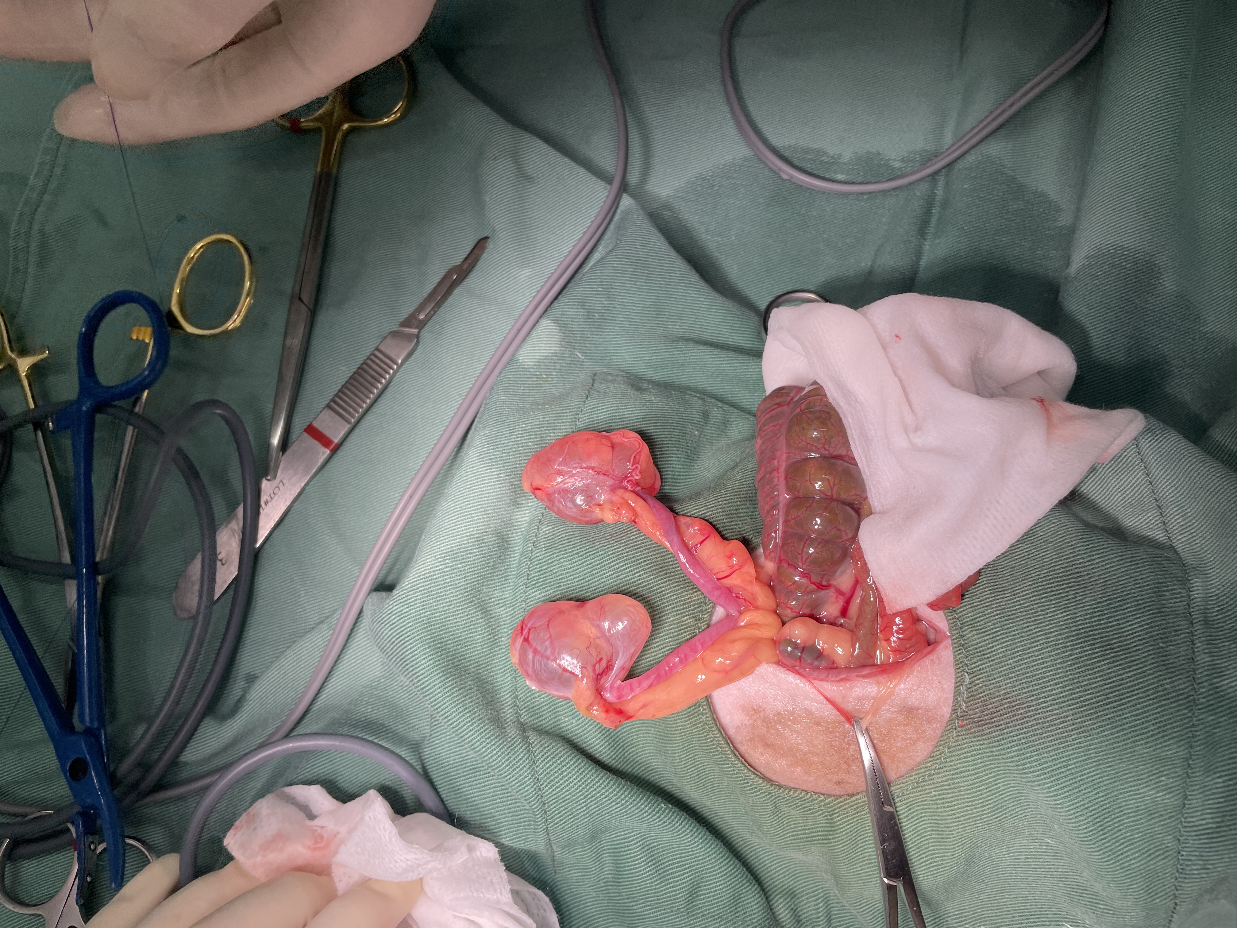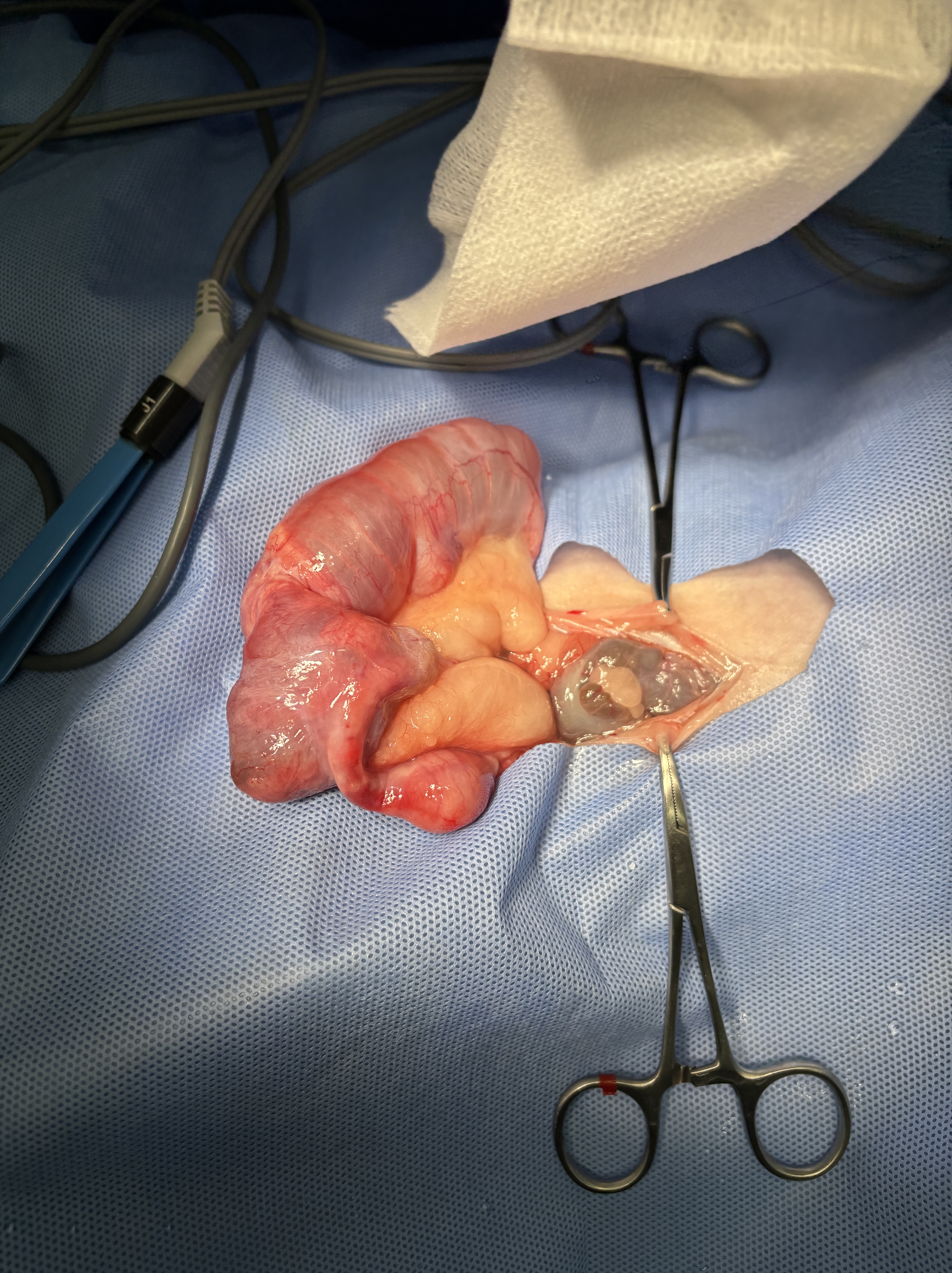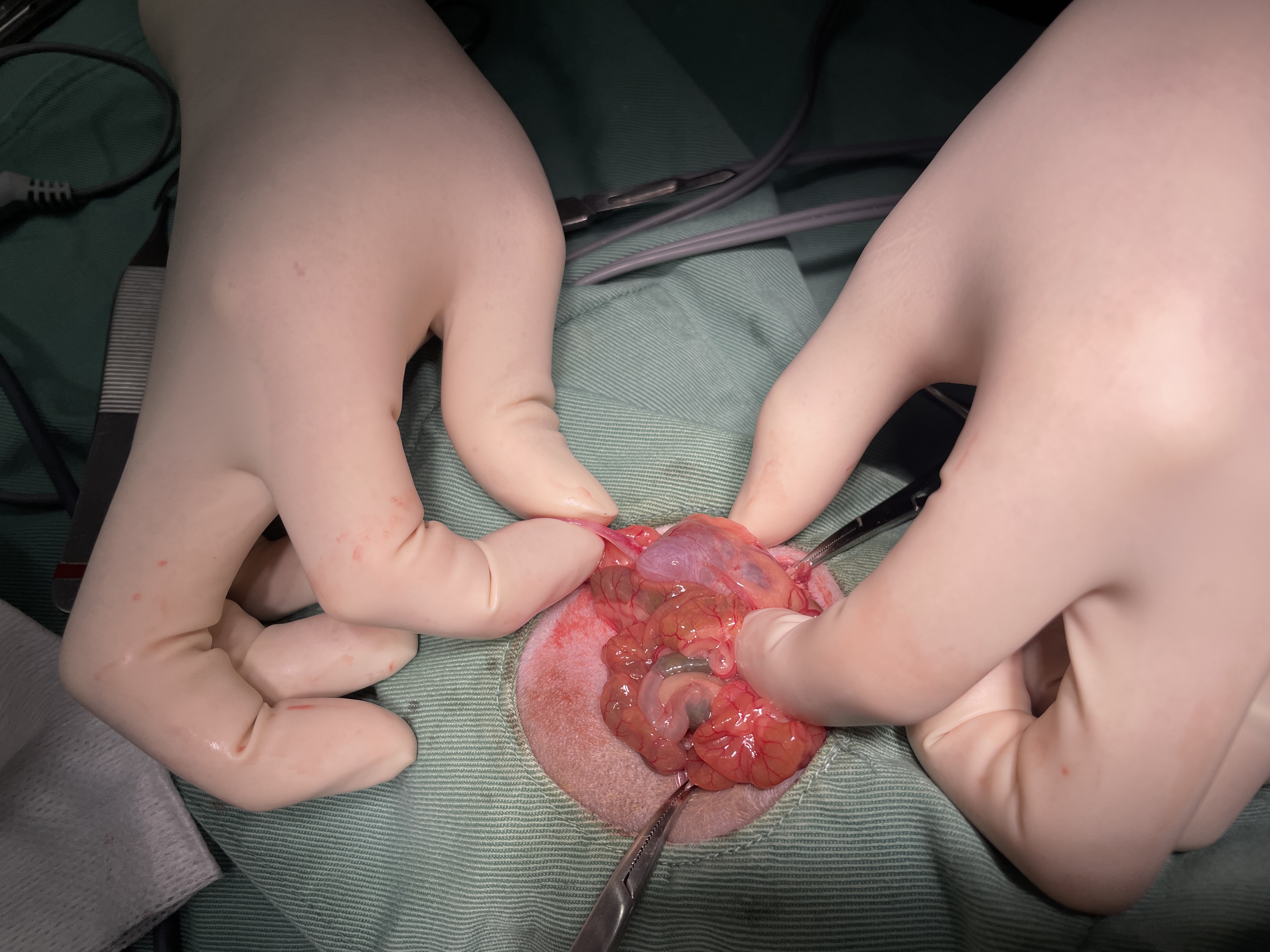 開腹をして卵巣を探し出したところです。モルモットの卵巣は深いところにあるので、引き出しても消化管に覆われているのが分かります。