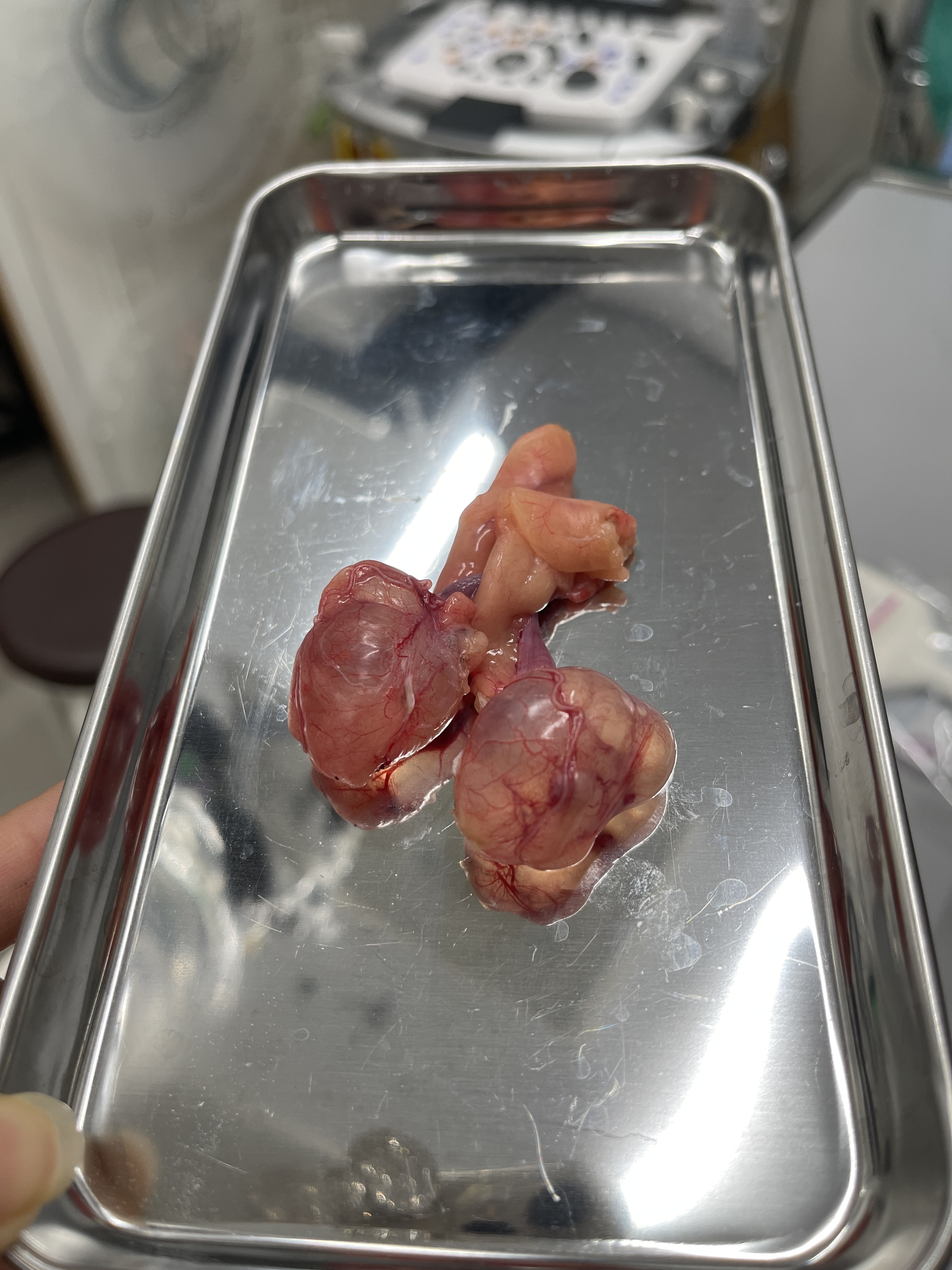 摘出した子宮と卵巣です。この組織を病理検査に出して診断をしてもらいます。診断は卵胞嚢腫でした。