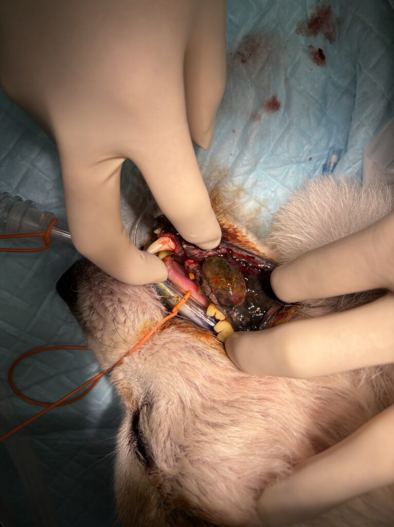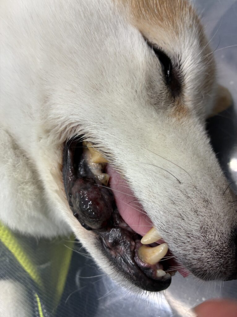 症例は 歳の柴犬で、口の中にできものがあるとの主訴で来院しました。鎮静をかけて細胞を取って見ると、メラノサイトという悪性黒色腫の原因となる細胞が多数見られたため、悪性黒色腫の可能性が高いと診断し、翌日に摘出手術を行いました。