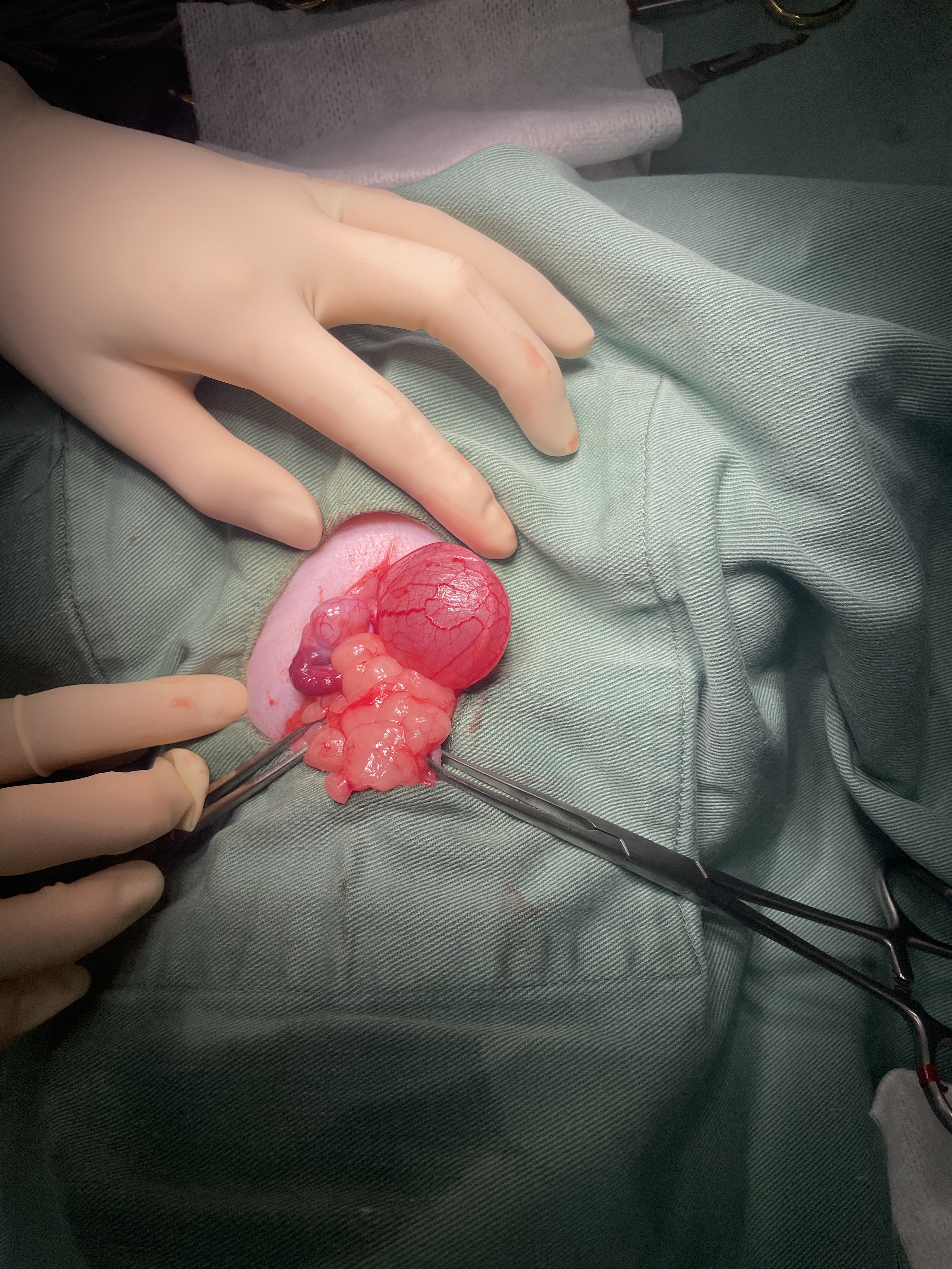 膀胱の隣りにあるのが未発達の精巣です。腹腔内に精巣が残っている状態だといずれ癌化する可能性が高いので、摘出を行います。腹腔内陰睾の手術をご希望の場合はご相談ください。