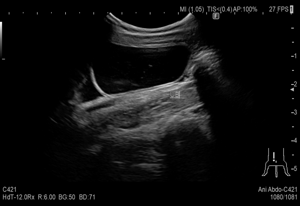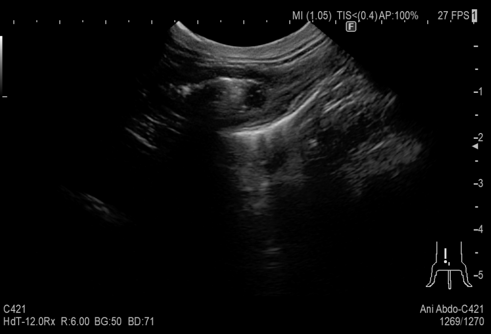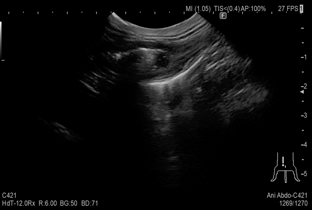 超音波検査にて消化管に腫瘍らしきできものが認められたため摘出を行いました。腹水が認められ、腹水の成分から腹腔内に炎症があることが分かりました。