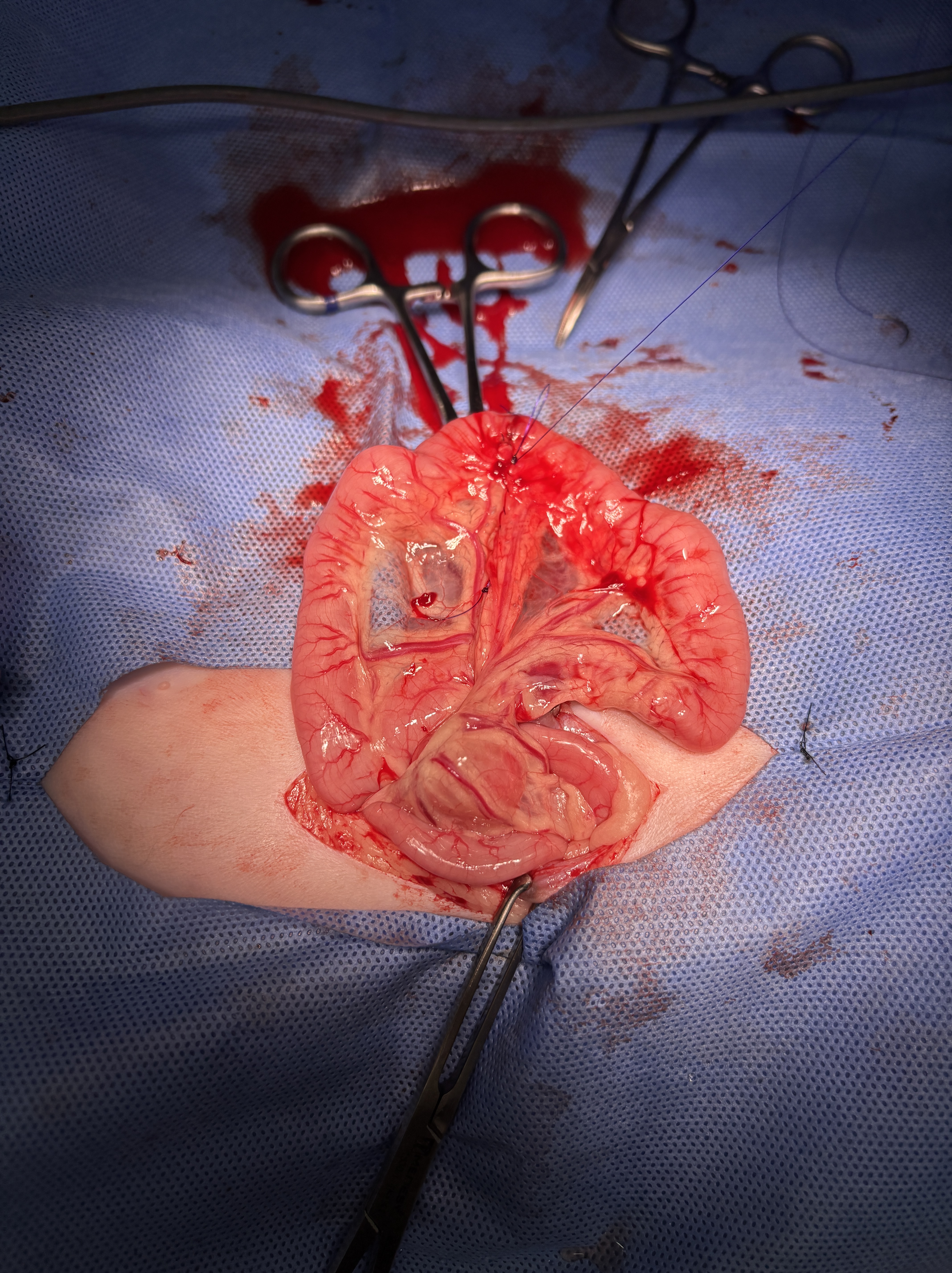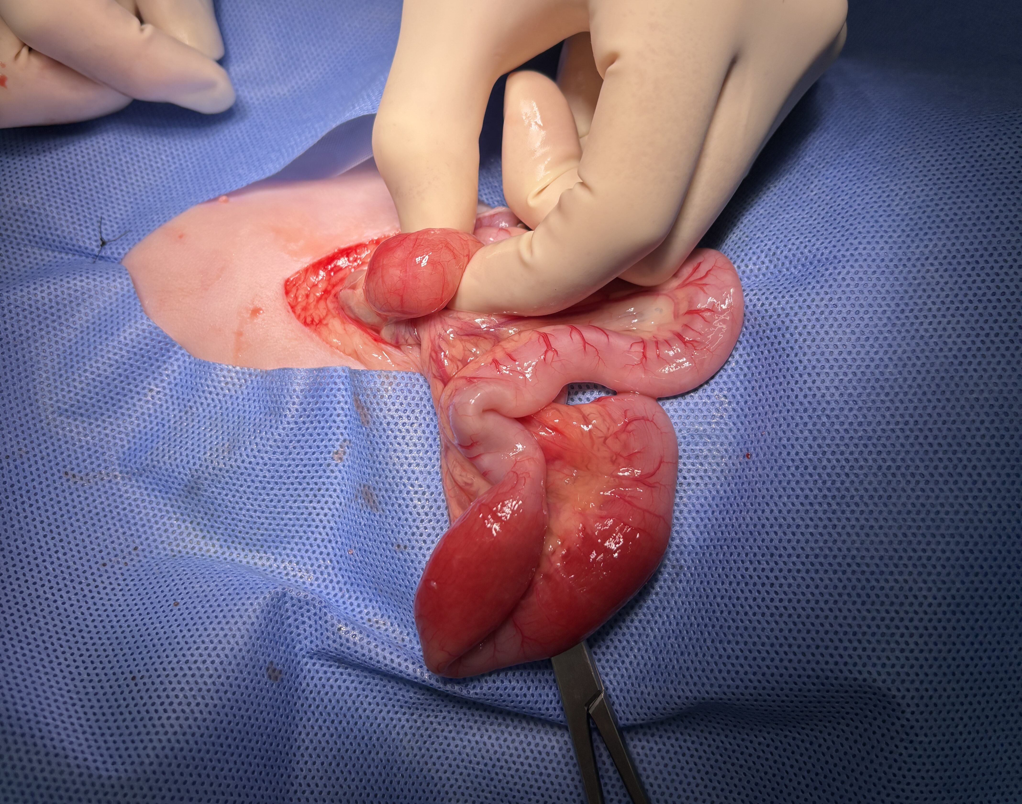 超音波検査にて消化管に腫瘍らしきできものが認められたため摘出を行いました。腹水が認められ、腹水の成分から腹腔内に炎症があることが分かりました。