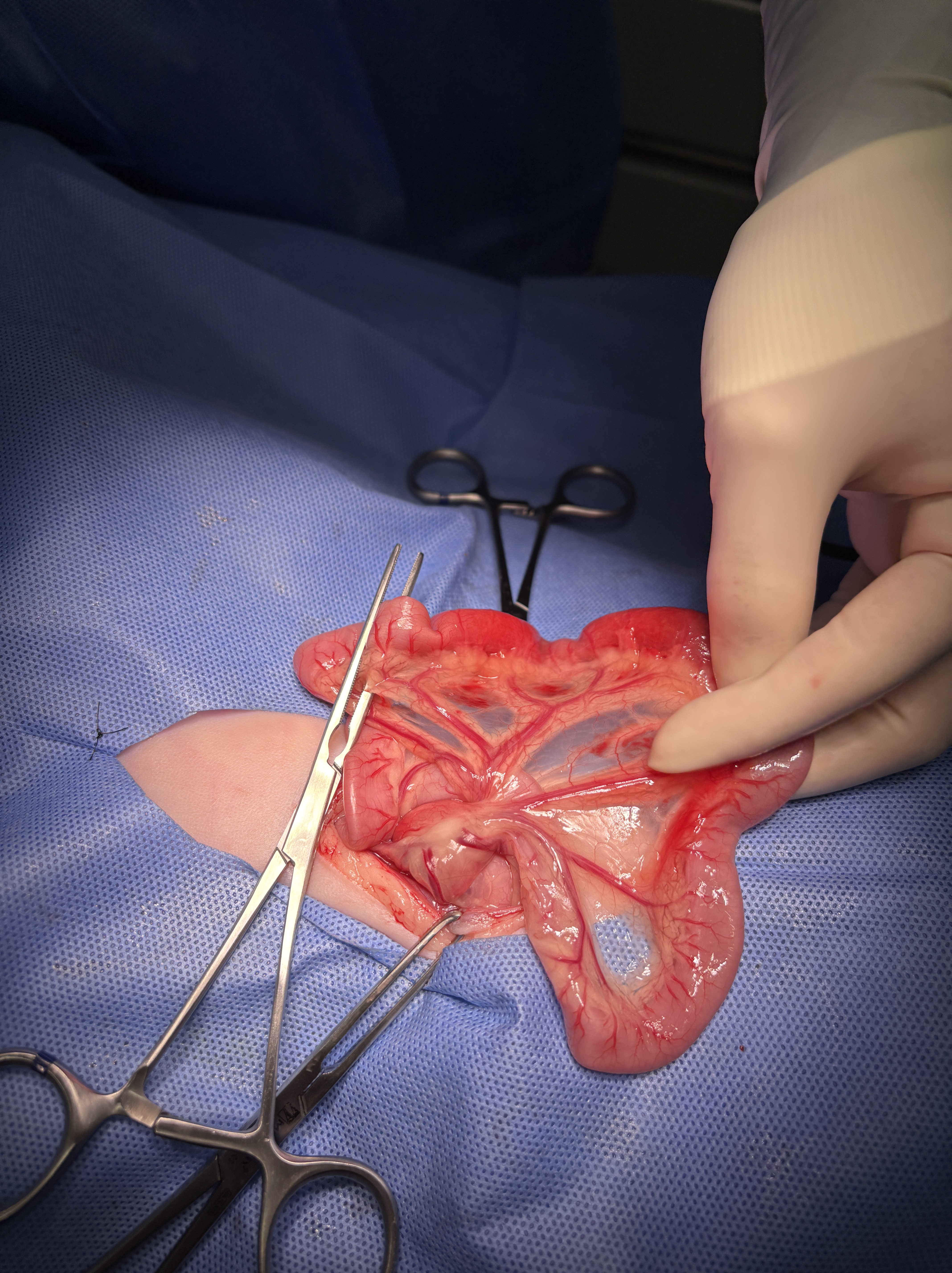 腸の赤くなっているところが腫瘍と思われたところです。病理検査の結果、腸全体が腫瘍化しており赤いところは炎症でした。指で持っているのは腫れている腸間膜リンパ節です。