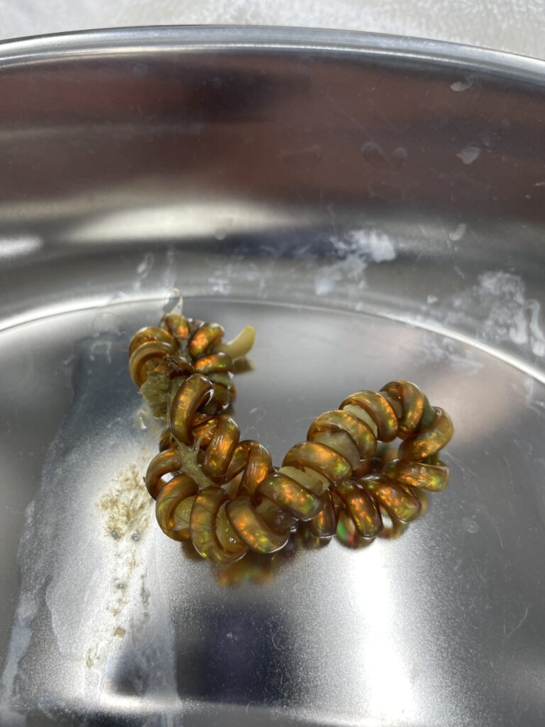 症例は若い犬で髪ゴムを食べたとの主訴で来院しました。吐かせる処置をしても吐かず、内視鏡で摘出をすることになりました。