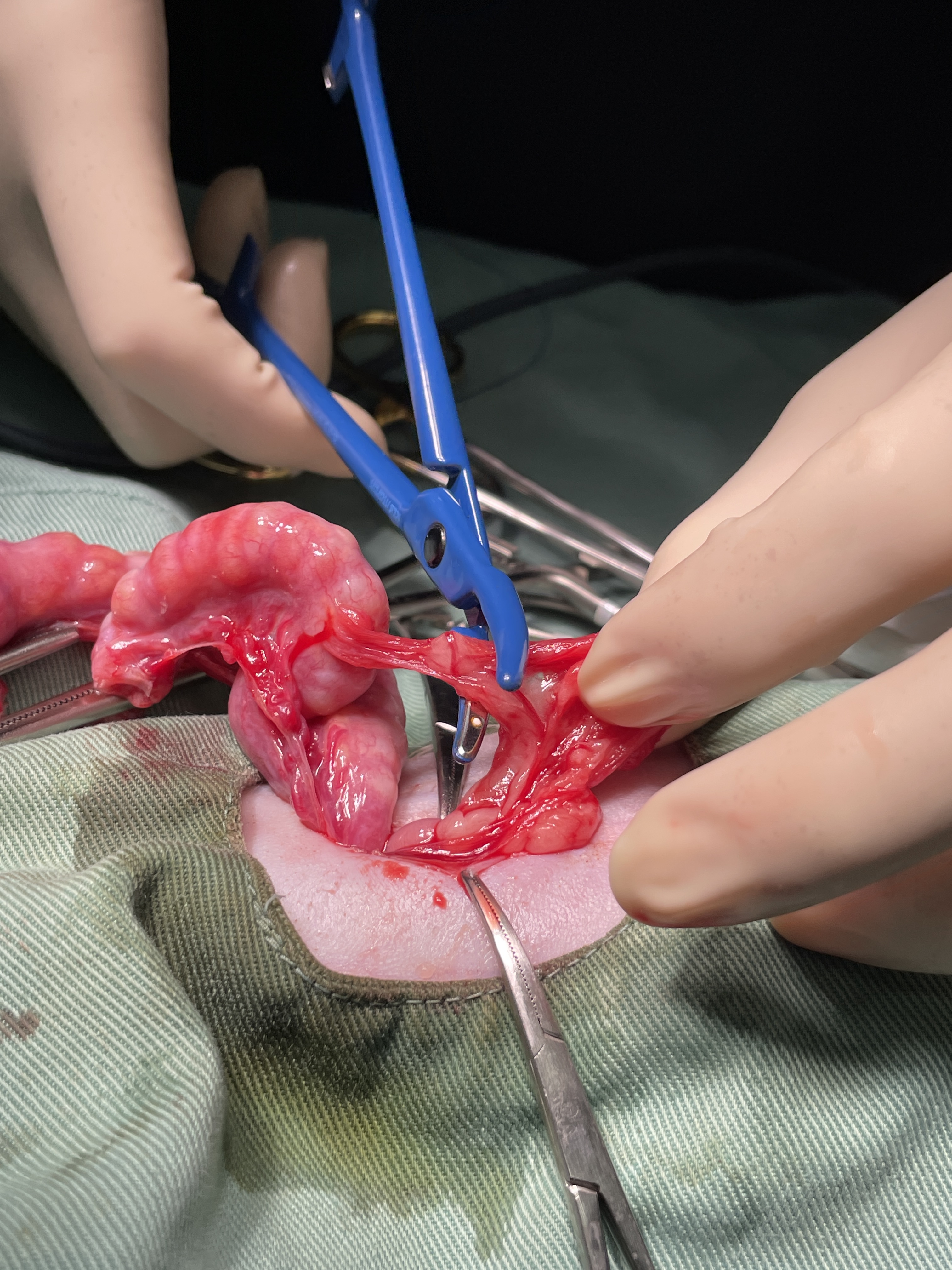 子宮を摘出しているところです。子宮は過去に破裂した形跡があり大網が癒着していました。