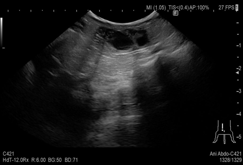 超音波検査では腫れた子宮が認められました。陰部からは大量の出血があり、貧血になっていたため緊急で手術を行いました。
